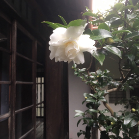 晩秋になると中庭の白山茶花の蕾が目立ち始め、十一月ともなれば白い花を咲かせ始めます。